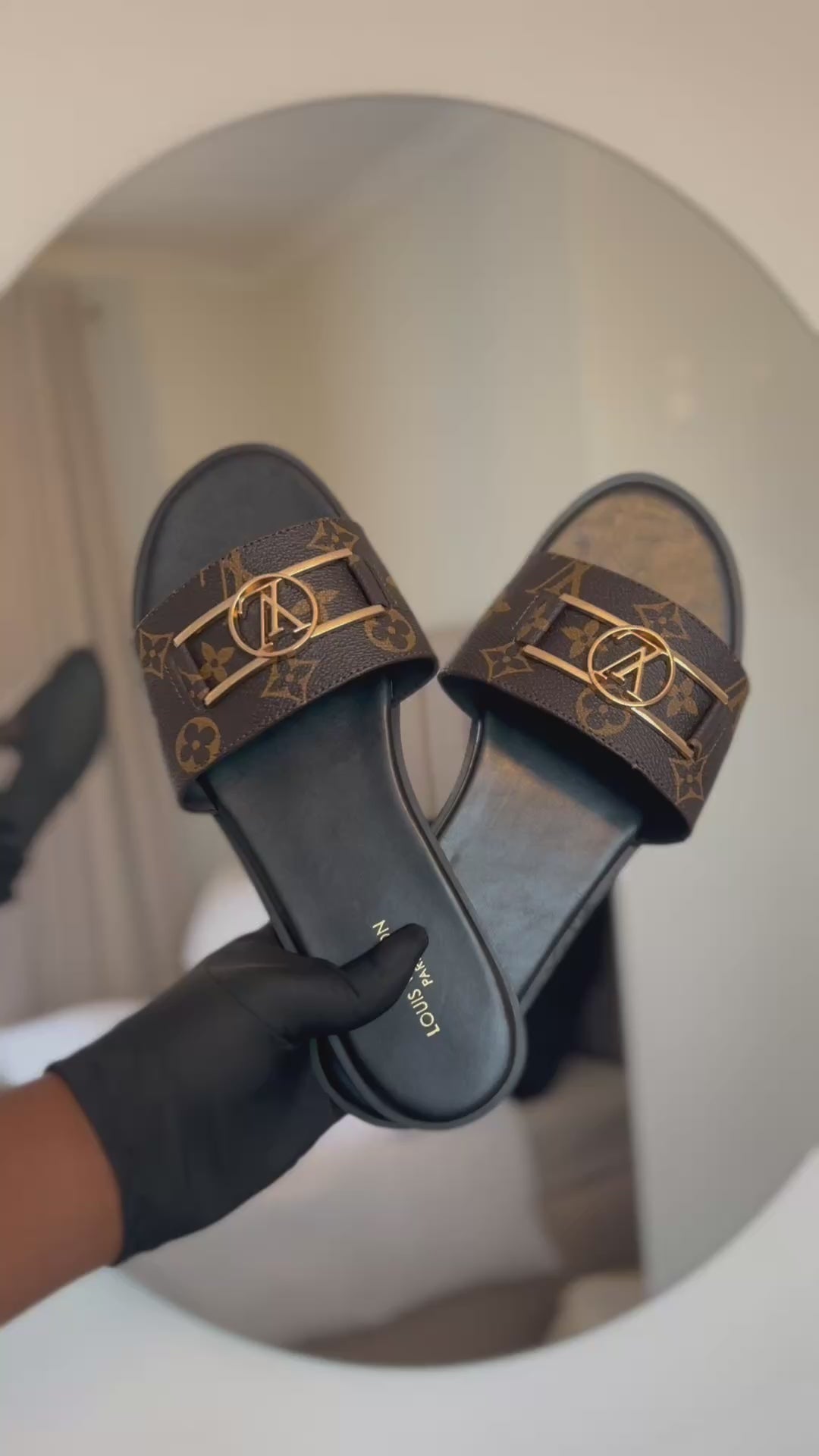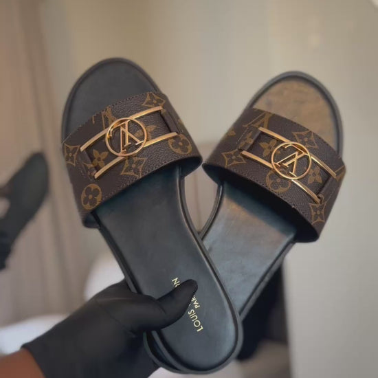 With the signature LV monogram print and a neutral brown hue, these Lock It flat slide sandals from Louis Vuitton are a fashion-forward choice for those who seek both style and practicality in their footwear.